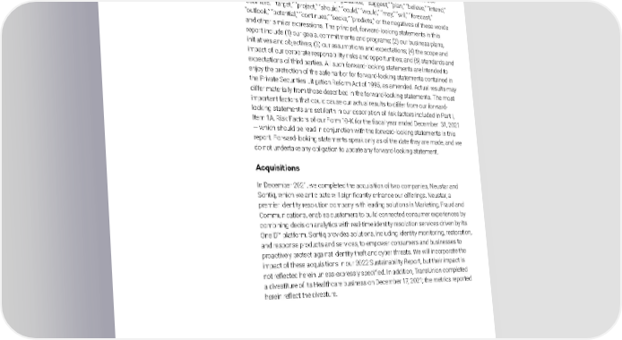 Forward-looking statements This report contains forward-looking statements which are based on our current assumptions and expectations. Any statements made in this report that are not statements of historical fact, including statements about our beliefs and expectations, are forward-looking statements. These statements often include words, such as “anticipate,” “expect,” “guidance,” “suggest,” “plan,” “believe,” “intend,” “estimate,” “target,” “project,” “should,” “could,” “would,” “may,” “will,” “forecast,” “outlook,” “potential,” “continues,” “seeks,” “predicts,” or the negatives of these words and other similar expressions. The principal, forward-looking statements in this report include (1) our goals, commitments and programs; (2) our business plans, initiatives and objectives; (3) our assumptions and expectations; (4) the scope and impact of our corporate responsibility risks and opportunities; and (5) standards and expectations of third parties. All such forward-looking statements are intended to enjoy the protection of the safe harbor for forward-looking statements contained in the Private Securities Litigation Reform Act of 1995, as amended. Actual results may differ materially from those described in the forward-looking statements. The most important factors that could cause our actual results to differ from our forward- looking statements are set forth in our description of risk factors included in Part I, Item 1A, Risk Factors of our Form 10-K for the fiscal year ended December 31, 2021 — which should be read in conjunction with the forward-looking statements in this report. Forward-looking statements speak only as of the date they are made, and we do not undertake any obligation to update any forward-looking statement. Acquisitions In December 2021, we completed the acquisition of two companies, Neustar and Sontiq, which we anticipate will significantly enhance our offerings. Neustar, a premier identity resolution company with leading solutions in Marketing, Fraud and Communications, enables customers to build connected consumer experiences by combining decision analytics with real-time identity resolution services driven by its OneID™ platform. Sontiq provides solutions, including identity monitoring, restoration, and response products and services, to empower consumers and businesses to proactively protect against identity theft and cyber threats. We will incorporate the impact of these acquisitions in our 2022 Sustainability Report, but their impact is not reflected herein unless expressly specified. In addition, TransUnion completed a divestiture of its Healthcare business on December 17, 2021; the metrics reported herein reflect the divesture. ABOUT THIS REPORT TRANSUNION | 2021 SUSTAINABILITY REPORT 7