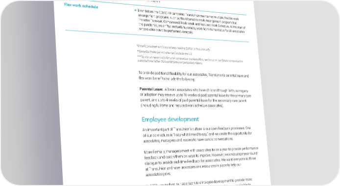 Education → Tuition reimbursement → Broad range of learning and development resources Time-off → Flexible Time Off for salaried associates → Paid Time Off for hourly associates → Volunteer Day Off Flex work schedule → Even before the COVID-19 pandemic, TransUnion maintained multiple, flexible work arrangement programs, such as the Alternative Work Arrangement program that includes Telework, Compressed Work Week and Reduced Work Schedule. At the start of the pandemic, we shifted instantly to remote, work-from-home status for all associates whose roles could be performed remotely. *Benefit provided to US associates making $100K or less annually. **Benefits limited or not provided outside the US ***To ensure we provide fair and competitive market offers, we focus on candidate compensation expectations rather than candidate compensation history. To provide additional flexibility for our associates, TransUnion’s parental leave and flex work benefits include the following: Parental Leave: All work associates who have children through birth, surrogacy or adoption may receive up to 10 weeks of paid parental leave for the primary care parent, and up to 4 weeks of paid parental leave for the secondary care parent (including full-time and reduced work schedule associates). Employee development An important part of TransUnion’s culture is our open feedback processes. One of our core values is “I say what I need to say,” and we create the opportunity for associates, managers and leaders to have candid conversations. More formally, managers meet with associates twice a year to provide performance feedback and coach them on ways to improve. However, we encourage year-round dialogue to provide real-time feedback for associates. We want everyone to thrive at TransUnion and have processes and resources in place to help our associates grow. In 2021, we evolved our approach to employee development to provide more customized development opportunities. In 2021, associates were eligible to participate in 9 career development programs, equating to an average of 0.5 days of training per associate and over 36,500 hours of training across the enterprise. PEOPLE AND DEI TRANSUNION | 2021 SUSTAINABILITY REPORT 37