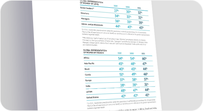 We continue to see progress within leadership as we march toward more equitable representation in our senior-most roles. The flexible work arrangements, development opportunities and network of Women @ TU chapters provide strong support to our female workforce. During 2020 and 2021, we saw a small dip in female directors. In 2021, we launched a global leadership mentorship program for high-performance women to network and develop their skills. GLOBAL REPRESENTATION OF WOMEN* BY LEVEL 2019 2020 2021 Senior leaders** % % % 27 30 32 Directors % % % 34 33 32 Managers % % % 36 35 35 Admin. and professionals % % % 44 43 43 *In 2021, TransUnion introduced the option for associates to identify as non-binary for US associates. The number of associates who chose to identify as non-binary is not reflected in the gender representation numbers reported herein. **We define our “senior leaders” as VP and above roles; “directors” encompass Director, Sr. Director, Principal, Sr. Principal and Sales VP level roles; “managers” are defined as Manager, Sr. Manager, Sales Manager, Advisor and Sr. Advisor level roles; and “admin and professionals” make up the rest of our associate population. GLOBAL REPRESENTATION OF WOMEN BY REGION 2019 2020 2021 Africa 54% 54% 60% Asia Pacific % % % 45 48 47 Brazil % % % 40 40 44 Canda % % % 51 49 46 Europe % % % 37 38 37 India % % % 28 28 31 LATAM % % % 48 47 44 United States 42% 42% 41% * In 2021, TransUnion introduced the option for associates to self-identify as non-binary for US associates. The number of associates who chose to identify as non-binary is not reflected in the gender representation numbers reported herein. TransUnion’s global gender representation varies by region. In Africa, Brazil and India, TransUnion has shown increases leading in our gender representation growth, while places like the United States, Europe and the Middle East remained stable. Conversely, we saw opportunities to improve in Canada and Asia Pacific. Our commitment to workplace excellence and inclusion has been recognized by the Great Places to Work Institute, across various regions including, India, Colombia and the United States. We have plans to help support our female employees and enterprise targets for each region while remaining cognizant of cultural differences in the many places where we operate. PEOPLE AND DEI TRANSUNION | 2021 SUSTAINABILITY REPORT 33