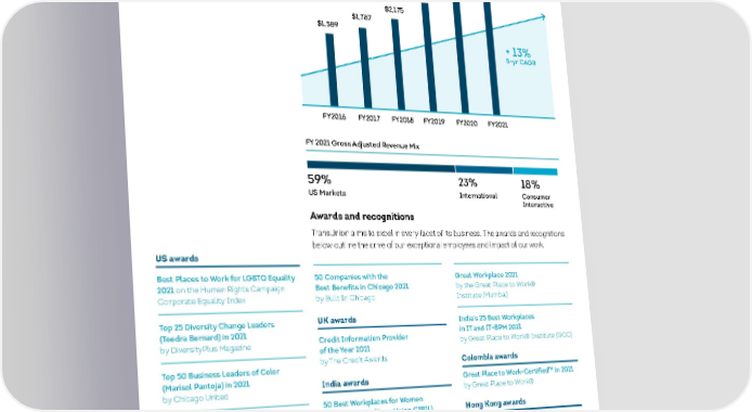 Financial results* Adjusted Revenue ($ in millions) $2,960 $2,531 $2,469 $2,175 $1,787 $1,589 + 13% 5-yr CAGR FY2016 FY2017 FY2018 FY2019 FY2020 FY2021 FY 2021 Gross Adjusted Revenue Mix 59% 23% 18% US Markets International Consumer Interactive Awards and recognitions TransUnion aims to excel in every facet of its business. The awards and recognitions below outline the drive of our exceptional employees and impact of our work. US awards Best Places to Work for LGBTQ Equality 50 Companies with the Great Workplace 2021 2021 on the Human Rights Campaign Best Benefits in Chicago 2021 by the Great Place to Work® Corporate Equality Index by Built In Chicago Institute (Mumbai) Top 25 Diversity Change Leaders UK awards India’s 25 Best Workplaces (Teedra Bernard) in 2021 Credit Information Provider in IT and IT-BPM 2021 by DiversityPlus Magazine of the Year 2021 by Great Place to Work® Institute (GCC) by The Credit Awards Colombia awards Top 50 Business Leaders of Color (Marisol Pantoja) in 2021 TM India awards Great Place to Work-Certified in 2021 by Chicago United by Great Place to Work® 50 Best Workplaces for Women 100 Best Adoption-Friendly in India in 2021 (TransUnion CIBIL) Hong Kong awards Workplaces of 2021 by Great Place to Work® Institute Recognized for three employer by Dave Thomas Foundation for Adoption excellence awards in 2021 India’s 100 Best Companies 100 Best Large Companies to Work for 2021 to Work for in Chicago 2021 by the Great Place to Work® Institute by Built In Chicago *Financial results include the Neustar and Sontiq acquisitions in the calculations since the date of acquisition and exclude the financial results of our Healthcare business in all periods. OUR BUSINESS TRANSUNION | 2021 SUSTAINABILITY REPORT 10