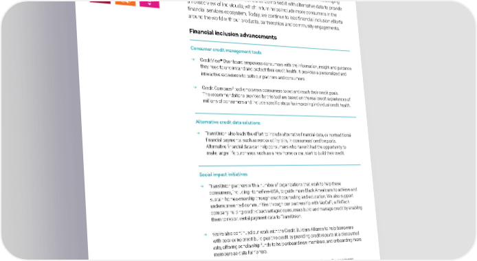Financial Financial inclusion is central to TransUnion’s mission and business purpose. We help consumers access credit solutions to pursue opportunities that enable them Inclusion to achieve life goals. Through access to financial education and credit management tools, we empower consumers to take control of their narrative. We recognize, however, some consumers face unique challenges, especially in underbanked and underrepresented communities. With that in mind, TransUnion pioneered bringing trended credit data to market, and then combined it with alternative data to provide a holistic view of individuals, which in turn helps include more consumers in the financial services ecosystem. Today, we continue to lead financial inclusion efforts around the world with our products, partnerships and community engagements. Financial inclusion advancements Consumer credit management tools → CreditView® Dashboard empowers consumers with the information, insight and guidance they need to understand and protect their credit health. It provides a personalized and interactive experience to both our partners and consumers. ® → Credit Compass tool empowers consumers to set and reach their credit goals. The recommendations provided by this tool are based on the real credit experiences of millions of consumers and include specific steps for improving individual credit health. Alternative credit data solutions → TransUnion also leads the effort to include alternative financial data, or nontraditional financial payments, such as rent or utility bills, in consumers’ credit reports. Alternative financial data can help consumers who haven’t had the opportunity to make larger life purchases, such as a new home or car, start to build their credit. Social impact initiatives → TransUnion partners with a number of organizations that work to help these consumers, including HomeFree-USA, to guide more Black Americans to achieve and sustain homeownership through credit counseling and education. We also support underrepresented communities through our partnership with MoCaFi, a FinTech company helping credit-disadvantaged consumers build and manage credit by enabling them to report rental payment data to TransUnion. → We’ve also continued our work with the Credit Builders Alliance to help borrowers with poor or no credit build positive credit by providing credit reports at a discounted rate, offering scholarship funds to help onboard new members, and onboarding more members as data furnishers. → In 2020, as part of our commitment to helping consumers during the pandemic, TransUnion, Experian and Equifax began offering US consumers free weekly credit reports which continues through 2022. In 2022, TransUnion and other credit bureaus went further by eliminating some types of medical debt collection from consumer credit reports. In the United States alone, over 100 million consumers accessed their TransUnion credit data (often free of charge) through our partners and website — along with many more internationally. FINANCIAL INCLUSION TRANSUNION | 2021 SUSTAINABILITY REPORT 14