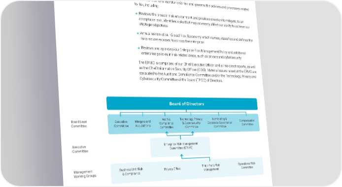 Risk review and escalation Our Enterprise Risk Management Committee (ERMC) sets TransUnion’s risk strategy and helps prioritize risk management activities across the company. The ERMC meets on a monthly basis to facilitate continuous improvement of TransUnion’s risk management capabilities. The ERMC monitors TransUnion’s risk and governs the policies and processes related to risk, including: → Reviews the broader risk environment and provides direction to mitigate, to an acceptable level, identified risks that may adversely affect our ability to achieve our strategic objectives → Annual review of our Global Risk Taxonomy which names, classifies and defines the risks we are exposed to across the enterprise → Reviews and approves our Enterprise Risk Management Policy and additional enterprise policies in risk-related areas, such as privacy and cybersecurity The ERMC is comprised of our Chief Executive Officer and all his direct reports, as well as the Chief Information Security Officer (CISO). Material issues raised at the ERMC are escalated to the Audit and Compliance Committee and/or the Technology, Privacy and Cybersecurity Committee of the Board (TPCC) of Directors. Board of Directors Board Level Executive Mergers and Audit & Technology, Privacy Nominating & Compensation Committee Committee Acquisitions Compliance & Cybersecurity Corporate Governance Committee Committee Committee Committee Executive Enterprise Risk Management Committee Committee (ERMC) Management Business Unit Risk Privacy Office Third-Party Risk Operational Risk Working Groups & Compliance Management Committee SECURITY, GOVERNANCE & COMPLIANCE TRANSUNION | 2021 SUSTAINABILITY REPORT 21