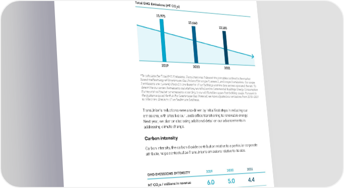 Greenhouse gas emissions performance From 2019 to 2021, TransUnion saw a drop in its year-over-year greenhouse gas emissions. Like many companies, our reductions in greenhouse gas emissions were driven by our workforce primarily working remotely due to the ongoing COVID-19 pandemic. Total GHG Emissions (MT CO e) 2 15,975 13,660 13,185 2019 2020 2021 *To calculate the Total GHG Emissions, TransUnion has followed the principles outlined in the market based methodology of Greenhouse Gas Protocol for scope 1, scope 2, and scope 3 emissions. Our scope 3 emissions are currently limited to the footprint of our buildings and the data servers operated therein. To determine our scope 3 emissions calculations, we relied on the Commercial Buildings Energy Consumption Survey and estimated our emissions according to our attributable square foot building usage. Pursuant to the guidance as set forth in the Greenhouse Gas Protocol, we have adjusted our emissions from 2019–2021 to reflect the divesture of our healthcare business. TransUnion’s reductions were also driven by initial first steps in reducing our emissions, with sites like our Leeds office transitioning to renewable energy. Next year, we plan on disclosing additional detail on our advancements in addressing climate change. Carbon intensity Carbon intensity, the carbon dioxide contribution relative to a particular corporate attribute, helps contextualize TransUnion’s emissions relative to its size. GHG EMISSIONS INTENSITY 2019 2020 2021 MT COe / millions in revenue 2 6.0 5.0 4.4 *TransUnion calculated the intensity of its GHG emissions by dividing total attributable GHG emissions with annual revenue for that given year. ENVIRONMENTAL FOOTPRINT TRANSUNION | 2021 SUSTAINABILITY REPORT 41
