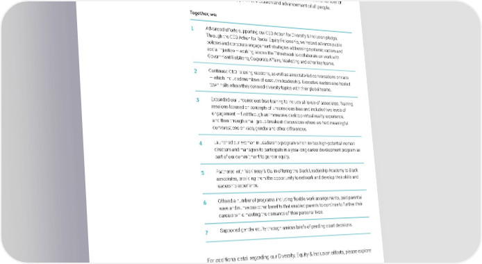 Diversity, equity and inclusion At TransUnion, we believe our collective differences make us stronger, more innovative, empathetic and successful. At a time when social and racial issues remain firmly at the global forefront, we stand united and committed to helping create a truly equitable environment for all. In 2021, TransUnion took a number of important actions to support the inclusion and advancement of all people. Together, we: 1 Advanced efforts supporting our CEO Action for Diversity & Inclusion pledge. Through the CEO Action for Racial Equity Fellowship, we helped advance public policies and corporate engagement strategies addressing systemic racism and social injustice — working across the TU network to collaborate on work with Government Relations, Corporate Affairs, Marketing and other key teams. 2 Continued CEO listening sessions, as well as associate-led conversations on race — which included members of executive leadership. Executive leaders also hosted town halls where they covered diversity topics with their global teams. 3 Expanded our unconscious bias training to include all levels of associates. Training sessions focused on concepts of unconscious bias and included two levels of engagement — first through an immersive desktop virtual reality experience, and then through small group breakout discussions where we held meaningful conversations on race, gender and other differences. 4 Launched our Women in Leadership program which invites high-potential women directors and managers to participate in a year-long career development program as part of our commitment to gender equity. 5 Partnered with McKinsey & Co. in offering the Black Leadership Academy to Black associates, providing them the opportunity to network and develop their skills and leadership experience. 6 Offered a number of programs, including flexible work arrangements, paid parental leave and numerous other benefits that enabled parents to continue to further their careers while meeting the demands of their personal lives. 7 Supported gender equity through amicus briefs of pending court decisions. For additional detail regarding our Diversity, Equity & Inclusion efforts, please explore our 2021 Diversity Report. PEOPLE AND DEI TRANSUNION | 2021 SUSTAINABILITY REPORT 30