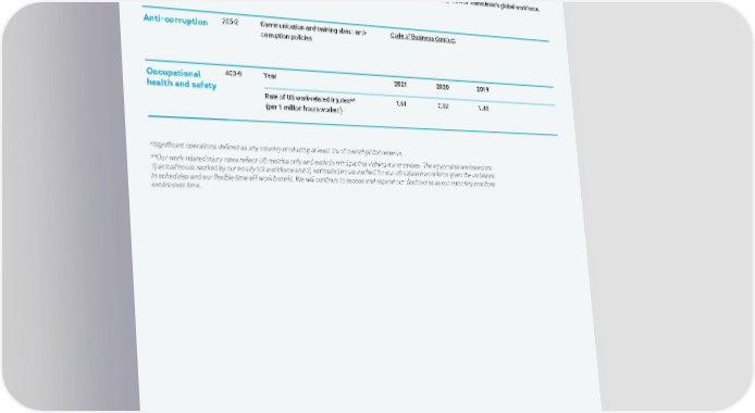 GENERAL DISCLOSURES Stakeholder 102-40 List of stakeholder groups Sustainability Report, p.13. engagement 102-41 Collective bargaining agreements 100% of TransUnion’s full-time and part-time employees in Brazil are covered under a collective bargaining agreement; this represents approximately 1.9% of TransUnion’s global workforce. Anti-corruption 205-2 Communication and training about anti- Code of Business Conduct corruption policies Occupational 403-9 Year 2021 2020 2019 health and safety Rate of US work-related injuries** 1.61 0.52 1.48 (per 1 million hours worked) *Significant operations defined as any country producing at least 1% of overall global revenue. **Our work-related injury rates reflect US metrics only and exclude third parties visiting our premises. The injury rates are based on: 1) actual hours worked by our hourly US workforce and 2) estimated hours worked for our US salaried workforce given the variations in schedules and our flexible time off work benefit. We will continue to assess and expand our disclosures as our reporting practices evolve over time. APPENDIX TRANSUNION | 2021 SUSTAINABILITY REPORT 51