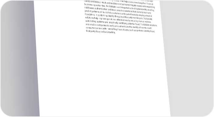 Fraud prevention Fraud is increasing in volume and sophistication and TransUnion is enhancing its fraud prevention capabilities in response. We developed a suite of solutions called TM TruValidate to help companies better identify and prevent fraud, quickly verify a consumer’s identity to secure trust across channels, and reduce friction in the loan origination or credit application process. This helps consumers keep their financial history and status intact, and enables companies to mitigate losses while expanding business opportunities. TruValidate is an integrated suite of digital identity proofing, risk-based authentication and fraud analytics solutions that works to learn and predict patterns of risk to help customers anticipate threats by staying ahead of fraudsters. In confirming identity throughout the customer lifecycle, TruValidate solutions help improve operational effectiveness by reducing manual reviews, automating systems and proactively identifying potential fraud. TruValidate solutions also enable companies to verify and authenticate the identity of new-to-credit consumers while better preventing fraud abuses, such as synthetic identity fraud, first-party fraud or loan stacking. CONSUMER PROTECTION TRANSUNION | 2021 SUSTAINABILITY REPORT 28