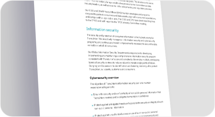 Cybersecurity and privacy risk management Ensuring our data is safe and properly stewarded is vital to keeping consumers protected and maintaining their trust. TransUnion maintains a dedicated TPCC as part of its Board of Directors. The TPCC assesses our risks to TransUnion’s technology and innovation strategy and approach, and monitors performance against its technology functionality and availability goals. The directors who serve in the TPCC collectively bring a wealth of experience to the Committee as data industry leaders, as well as experts in the policymaking and regulatory process. Our CISO and Chief Privacy Officer (CPO) maintain strategies and programs designed to protect consumers and data assets, align with consumer expectations, and comply with all applicable laws. The CISO and CPO have direct reporting lines to the TPCC and both report to the TPCC at every Committee meeting. Information security The security and protection of consumer information is the highest priority for TransUnion. We proactively manage our information security and cybersecurity programs, and continuously invest in improvements necessary to secure the data we hold on behalf of consumers. Our Global Information Security Department is responsible for developing, implementing and maintaining a comprehensive information security program consistent with TransUnion’s size and complexity. We employ multiple, overlapping layers of security controls to reduce risk and eliminate single points of failure. Our program focuses on risk identification and fostering resiliency, all to protect TransUnion, our assets, customers and consumers. Cybersecurity overview The objective of TransUnion’s information security plan is to maintain reasonable safeguards to: → Ensure the security and confidentiality of non-public personal information that TransUnion receives and is obligated to maintain in confidence → Protect against anticipated threats or hazards to the security or integrity of such non-public personal information → Protect against unauthorized access or use of such non-public personal information that could result in substantial harm or inconvenience to any consumer SECURITY, GOVERNANCE & COMPLIANCE TRANSUNION | 2021 SUSTAINABILITY REPORT 22