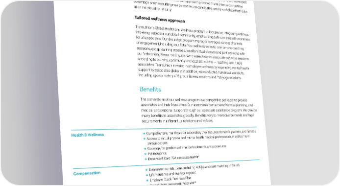 Employee Wellness During 2021, focusing on the well-being of our employees took new meaning as our people dealt with the second year of the COVID-19 pandemic. We continued to provide associates with flexibility to balance the demands of different aspects of their lives. Furthermore, we expanded the benefits we offered associates globally and developed a new DEI approach to wellness. Our approach provided TransUnion a competitive advantage when recruiting new personnel, as candidates seek a workplace that looks at an individual holistically. Tailored wellness approach TransUnion’s Global Health and Wellness program is focused on integrating wellness into every aspect of our global community, emphasizing self-care and self-awareness for all associates. Our dedicated program manager leverages various channels of engagement, including: our Total You wellness website, one-on-one coaching sessions, group learning sessions, weekly virtual classes and joint sessions with our Networking Resource Groups. We created tailored associate wellness sessions according to country, community and local DEI criteria — reaching over 1,000 associates. TransUnion invested in employee wellness by expanding mental health support to associates globally. In addition, we conducted numerous workouts, including approximately 416 group fitness sessions and 156 yoga sessions. Benefits The cornerstone of our wellness program is a competitive package we provide associates and their loved ones. Our associates can access financial planning, and medical and personal support through our associate assistance program. We provide many benefits to associates globally. Benefits vary to meet diverse needs and legal requirements in different jurisdictions and include: Health & Wellness → Comprehensive healthcare for associates, their spouses/domestic partners, and families → Access to virtual physical and mental health medical professionals, in addition to in- person options → Coverage for gender confirmation treatments and procedures → Pet insurance → Dependent Care FSA associate match* Compensation → Retirement contributions, including 401(k) associate matching in the US → Life insurance and survivor support → Employee Stock Purchase Plan → Transit Reimbursement Program** → Perks Discount Program** → Fair and competitive market offers, independent of candidate’s compensation history*** Family → Paid leave for new parents → Support for family planning, including adoption assistance and infertility coverage → Flexible and remote work arrangements → Care@Work program for additional support taking care of loved ones** PEOPLE AND DEI TRANSUNION | 2021 SUSTAINABILITY REPORT 36