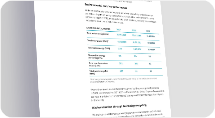 Natural resources and waste management Beyond reducing its contributions to climate change, TransUnion seeks to be a sound environmental steward of natural resources. As an information and analytics company, our impact on natural resources is comparably less than companies in other industries. Our key focus areas in managing and reducing our waste are efficient use of our real estate’s assets and technology. Environmental metrics performance While we continue to grow and expand, we believe productivity and achievement are not contingent on having associates work in an office environment. Since the pandemic began in 2019, we closed a total of 31 locations, resulting in considerable reductions in our use of natural resources. ENVIRONMENTAL METRIC 2019 2020 2021 Total water use (gallons) 31,082,623 13,873,089 11,430,922 Total energy use (kWh)* 44,710,500 41,751,081 41,110,368 Renewable energy (kWh) 0.00 2,392,004 2,245,167 Renewable energy 0% 6% 5% percentage (%) Total non-hazardous 502 105 82 waste (tons) Total waste recycled 637 44 15 (tons) *Total energy use excludes the procurement of renewable energy as it is used as part of our GHG emissions strategy and reporting. We continue to reduce our impact through our building management practices. In 2021, we renewed the ISO 14001 certification of our United Kingdom headquarters. We have maintained an Environmental Management System for more than 10 years in this facility. Waste reduction through technology recycling We maintain a waste management program to reuse electronics and reduce all waste. We also encourage our associates and contractors to minimize the waste they create, and reuse and recycle materials whenever possible. In 2021, we saw an increase in the amount of recycled e-waste as a result of server decommissioning. HAZARDOUS WASTE 2019 2020 2021 Recycled e-waste (tons) 33 29 62 ENVIRONMENTAL FOOTPRINT TRANSUNION | 2021 SUSTAINABILITY REPORT 42
