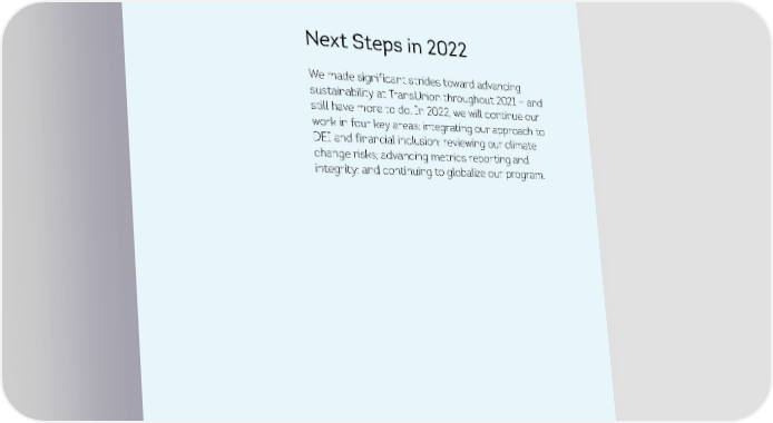 N ext Steps in 2022 We made significant strides toward advancing sustainability at TransUnion throughout 2021 — and still have more to do. In 2022, we will continue our work in four key areas: integrating our approach to DEI and financial inclusion; reviewing our climate change risks; advancing metrics reporting and integrity; and continuing to globalize our program. TRANSUNION | 2021 SUSTAINABILITY REPORT 44