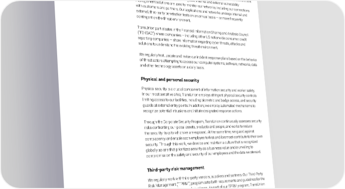 Cyber threat and intelligence Our Cyber Threat and Intelligence function tracks and classifies potential information security-related events. Within our 24/7/365 Security Operations Center, TransUnion associates monitor for any attempts to access our systems or data. We deploy industry-leading security solutions to manage the vulnerability and threat environment affecting our businesses across the globe. Internal and external vulnerability management solutions are used to monitor our networks, including our connections with customers and partners. Our applications and networks undergo internal and external, third-party penetration tests on an annual basis — or more frequently contingent on the threat environment. TransUnion participates in the Financial Information Sharing and Analysis Council (“FS-ISAC”) where companies — including other US nationwide consumer credit reporting companies — share information regarding cyber threats, attacks and solutions to understand the evolving threat environment. We regularly test, update and revise our incident response plans based on the behavior of threat actors attempting to access our computer systems, software, networks, data and other technology assets on a daily basis. Physical and personal security Physical security is a crucial component of information security and worker safety. In our most sensitive sites, TransUnion employs stringent physical security controls limiting access to our facilities, including biometric and badge access, and security guards at external entry points. In addition, we employ automated mechanisms to recognize potential intrusions and initiate designated response actions. Through the Corporate Security Program, TransUnion continuously assesses security risks confronting our global assets, products and people, and works to reduce the security risks to which we are exposed. At the same time, we guard against complacency and enable each employee to first and foremost contribute to their own security. Through this work, we develop and maintain a culture that is recognized globally as one that prioritizes security as a business value and is unwilling to compromise on the safety and security of our employees and the data we steward. Third-party risk management We regularly work with third-party vendors, suppliers and partners. Our Third-Party Risk Management (“TPRM”) program sets forth requirements and guidelines for the third parties with whom we do business. As part of our TPRM program, TransUnion uses an Enterprise Security Ratings Platform which gathers terabytes of data from security sensors around the world, and provides insights concerning potential risks emanating from infected machines, improper configuration, poor security hygiene and harmful user behavior. Each third-party company receives a security rating based on the severity, frequency and duration of security incidents. When third parties do not meet our standards, we terminate our relationship with them and look for new partners that meet our security and stewardship requirements. SECURITY, GOVERNANCE & COMPLIANCE TRANSUNION | 2021 SUSTAINABILITY REPORT 25