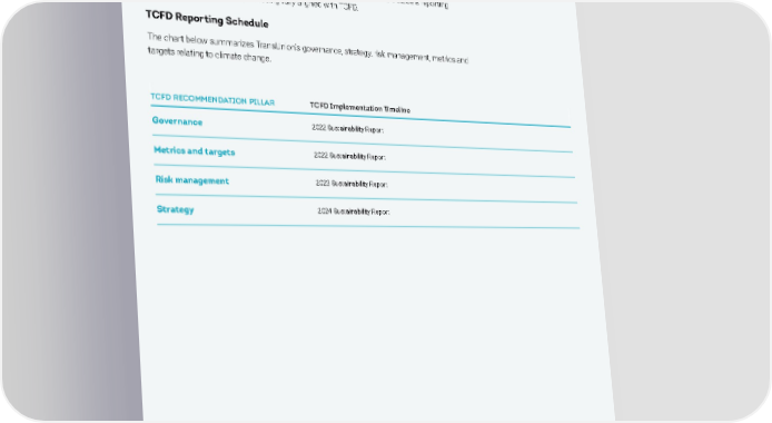 TCFD recommendations Below marks TransUnion’s first TCFD Appendix. In 2021, TransUnion made significant advancements in our efforts to address climate change. First, TransUnion engaged an external consultant to help us set our GHG emissions baseline. Next, guided by our 2019 baseline, we developed a climate change strategy and targets. The section that follows details our climate change approach in alignment with the standards set by TCFD. We also include a reporting schedule of when we anticipate being fully aligned with TCFD. TCFD Reporting Schedule The chart below summarizes TransUnion’s governance, strategy, risk management, metrics and targets relating to climate change. TCFD RECOMMENDATION PILLAR TCFD Implementation Timeline Governance 2022 Sustainability Report Metrics and targets 2022 Sustainability Report Risk management 2023 Sustainability Report Strategy 2024 Sustainability Report APPENDIX TRANSUNION | 2021 SUSTAINABILITY REPORT 48