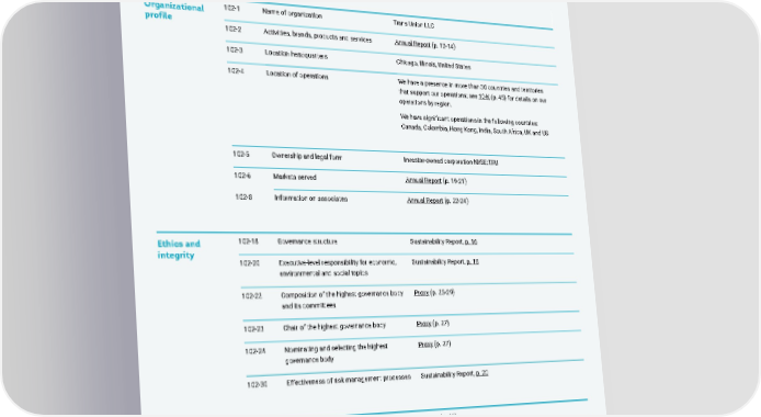 GRI Standards This report references the Global Reporting Initiative (GRI) standards, or portions of the standards, as indicated below. Unless expressly stated otherwise, all data disclosed covers the global organization and full calendar year through December 31, 2021. GENERAL DISCLOSURES Organizational 102-1 Name of organization Trans Union LLC profile 102-2 Activities, brands, products and services Annual Report (p. 12-14) 102-3 Location headquarters Chicago, Illinois, United States 102-4 Location of operations We have a presence in more than 30 countries and territories that support our operations; see 10-K (p. 45) for details on our operations by region. We have significant operations in the following countries: Canada, Colombia, Hong Kong, India, South Africa, UK and US 102-5 Ownership and legal form Investor-owned corporation NYSE:TRU 102-6 Markets served Annual Report (p. 19-21) 102-8 Information on associates Annual Report (p. 22-24) Ethics and 102-18 Governance structure Sustainability Report, p. 16 integrity 102-20 Executive-level responsibility for economic, Sustainability Report, p. 18 environmental and social topics 102-22 Composition of the highest governance body Proxy (p. 25-29) and its committees 102-23 Chair of the highest governance body Proxy (p. 27) 102-24 Nominating and selecting the highest Proxy (p. 27) governance body 102-30 Effectiveness of risk management processes Sustainability Report, p. 20 Compensation 102-30 Remuneration policies Proxy Statement Proxy (p. 46) 102-36.A Process for determining remuneration Proxy (p. 48) 102-38 Annual total compensation ratio Proxy (p. 77) APPENDIX TRANSUNION | 2021 SUSTAINABILITY REPORT 50