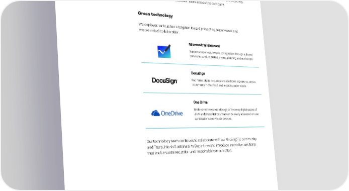 Associate environmental action TransUnion’s associates are passionate about taking steps to reduce their environmental impact in the office and at home. We leveraged this passion to expand the opportunities for associates to reduce their impact regardless of their location. We held awareness webinars on waste reduction and recycling, and invested in virtual collaboration tools across the company. Green technology We deployed various tools targeted toward preventing paper waste and enable virtual collaboration. Microsoft Whiteboard Supports paperless, remote collaboration through a shared canvas to conduct brainstorming, planning and workshops DocuSign Facilitates digital requests and electronic signatures, stores documents in the cloud and replaces paper waste One Drive Enables remote cloud storage to file away digital copies of work and presentations that can be easily accessed on user workstations and mobile devices Our technology team continues to collaborate with our Green@TU community and TransUnion’s Sustainability Department to introduce innovative solutions that enable waste reduction and responsible consumption. ENVIRONMENTAL FOOTPRINT TRANSUNION | 2021 SUSTAINABILITY REPORT 43