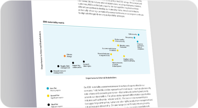 Determining TransUnion regularly collects feedback from internal and external stakeholders to determine our ESG priorities. In 2021, we refreshed our ESG materiality assessment ESG to prioritize the ESG issues most important to our stakeholders. Materiality The assessment process started with a gap analysis and industry benchmarking, as well as a review of international sustainability frameworks and ratings, including the SASB, TCFD, GRI, UN SDGs, and frequently cited ESG ratings. We surveyed and interviewed 36 internal and external stakeholders, including employees, investors, customers, NGOs and industry experts. We leveraged the insights from these different perspectives to develop our materiality matrix. We are committed to periodically refreshing our materiality assessment to ensure our program continues to align with the quickly evolving sustainability landscape. ESG materiality matrix s Cybersecurity er Data privacy Product quality ehold & data accuracy tak Corporate S Diversity, equity governance, & inclusion ethics & Customer satisfaction compliance & relations Climate Financial inclusion to External change & empowerment Employee safety, health & well-being Talent attraction, Supporting Human & retention mportance Supply chain communities labor rights & development I management Natural resource management Importance to Internal Stakeholders First Tier Our ESG materiality assessment revealed three tiers of opportunities for our Priority topics company. First, the blue circles represent confirmed issues — such as cybersecurity, Second Tier data privacy and corporate governance — that continue to be the highest priority Significant topics areas to our stakeholders. The yellow circles represent differentiation opportunities in topics such as financial inclusion and DEI. The black circles represent topics Third Tier like supporting communities, human and labor rights, supply chain management and Relevant topics natural resource stewardship. Climate change did not fit neatly into any grouping, Outlier and while the ranking is relatively low for our industry, increasing expectations to manage and disclose climate change impacts elevates it to a significant ESG topic for TransUnion. It is important to note all issues on the ESG Materiality Matrix are relevant to the company regardless of their location on the matrix. DETERMINING ESG MATERIALITY TRANSUNION | 2021 SUSTAINABILITY REPORT 13