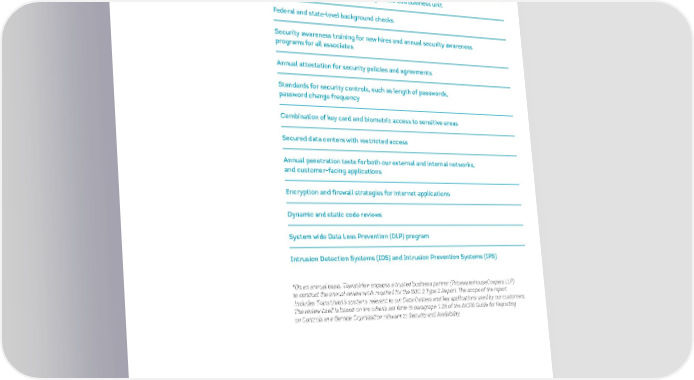 Information security features TransUnion’s Information Security program is aligned with industry best practices. The features of our program include: Restricted data access according to job role and business unit Federal and state-level background checks Security awareness training for new hires and annual security awareness programs for all associates Annual attestation for security policies and agreements Standards for security controls, such as length of passwords, password change frequency Combination of key card and biometric access to sensitive areas Secured data centers with restricted access Annual penetration tests for both our external and internal networks, and customer-facing applications Encryption and firewall strategies for internet applications Dynamic and static code reviews System wide Data Loss Prevention (DLP) program Intrusion Detection Systems (IDS) and Intrusion Prevention Systems (IPS) *On an annual basis, TransUnion engages a trusted business partner (PricewaterhouseCoopers LLP) to conduct the annual review work required for the SOC 2 Type 2 Report. The scope of the report includes TransUnion’s systems relevant to our Data Centers and key applications used by our customers. The review itself is based on the criteria set forth in paragraph 1.26 of the AICPA Guide for Reporting on Controls at a Service Organization relevant to Security and Availability. SECURITY, GOVERNANCE & COMPLIANCE TRANSUNION | 2021 SUSTAINABILITY REPORT 23