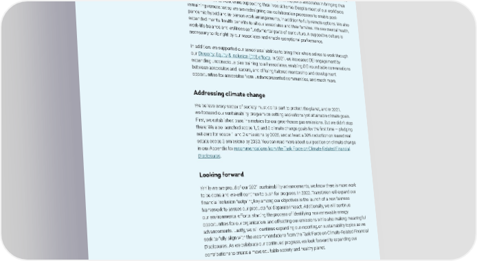 Reimagining work Providing increased work flexibility is critical to remaining competitive at a time when the demand for skilled professionals has never been higher. The COVID-19 pandemic offered us a chance to reimagine the way we work together. Over the last two years, we discovered we are united by a common sense of purpose rather than a location or an office. At TransUnion, we are fostering an environment of belonging and flexibility that supports associates in bringing their authentic selves to work while supporting their lives at home. Despite most of our workforce remaining remote today, we are redesigning our collaboration processes to enable post- pandemic hybrid and in-person work arrangements, in addition to fully remote options. We also expanded mental health benefits to all our associates and their families. We see mental health, work-life balance and wellness as fundamental parts of our culture. A supportive culture is necessary to do right by our associates and enable exceptional performance. In addition, we supported our associates’ abilities to bring their whole selves to work through our Diversity, Equity & Inclusion (DEI) efforts. In 2021, we increased DEI engagement by expanding unconscious bias training to all associates, enabling DEI roundtable conversations between associates and leaders, and offering tailored mentorship and development opportunities for associates from underrepresented communities, and much more. Addressing climate change We believe every sector of society must do its part to protect the planet, and in 2021, we focused our sustainability program on setting aspirational yet attainable climate goals. First, we established baseline metrics for our greenhouse gas emissions. But we didn’t stop there: We also launched scope 1, 2 and 3 climate change goals for the first time — pledging net-zero for scope 1 and 2 emissions by 2025, and at least a 30% reduction on leased real estate scope 3 emissions by 2030. You can read more about our position on climate change in our Appendix for recommendations from the Task Force on Climate-Related Financial Disclosures. Looking forward While we are proud of our 2021 sustainability advancements, we know there is more work to be done and we will continue to push for progress. In 2022, TransUnion will expand our financial inclusion footprint; key among our objectives is the launch of a new fairness framework to assess our products for disparate impact. Additionally, we will continue our environmental efforts, starting the process of identifying new renewable energy opportunities for our organization, and offsetting our emissions while also making meaningful advancements. Lastly, we will continue expanding our reporting on sustainability topics as we seek to fully align with the recommendations from the Task Force on Climate-Related Financial Disclosures. As we celebrate our continued progress, we look forward to expanding our contributions to create a more equitable society and healthy planet. Sincerely, Chris Cartwright | President and Chief Executive Officer TRANSUNION | 2021 SUSTAINABILITY REPORT 5