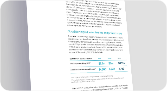 Communities We are committed to increasing opportunities for people around the world, especially in traditionally underserved communities. We support our communities through our procurement practices, charitable giving and volunteering. Supply chain management TransUnion recognizes the importance of having a robust and responsible supply chain. In 2021, we established partnerships with the National Minority Supplier Development Council, Women’s Business Enterprise National Council, National LGBT Chamber of Commerce and Disability:IN — non-profit organizations which certify and advocate for the inclusion of diverse-owned businesses in corporate supply chains. This year, we also included second-tier supplier diversity requirements in all our supplier contract templates. Our Procurement team has committed that for each competitive sourcing opportunity, it will search for qualified, diverse suppliers to compete for TransUnion’s business. We perform a weekly review of our sourcing opportunity pipeline, verify the certification status of our suppliers annually and review our progress internally on a quarterly basis. GoodWorks@TU, volunteering and philanthropy TransUnion’s GoodWorks@TU program creates stronger communities. Our teams organize group volunteer efforts, and many of our associates commit their personal time to a variety of endeavors. We also offer a matching gift program, matching up to $2,000 per year for each associate donation made to 501(c)(3) organizations in the US and to registered charities in Canada. In 2021, we matched $478,012 in associate non-profit donations through TransUnion’s matching gift program and donated $1M supporting COVID-19 relief in India. COMMUNITY OUTREACH DATA 2019 2020 2021 Total corporate giving (USD)* $1.5m $2m $4.9m Associate time volunteered (hours)** 14,200 6,240 4,742 *Total corporate giving numbers are approximates and include gift matching. **TransUnion offers all US-based associates with a volunteer day each year to donate time outside the office to a cause that matters to them. While COVID-19 continued to limit our ability to volunteer, associates found ways to safely support their communities and logged approximately 4,742 hours. They also stepped up significantly to provide financial help. TransUnion maintains relationships with various non-profit and academic organizations that we engage through our charitable giving and employee volunteering. We seek to maximize opportunities for people everywhere, focusing on underrepresented and under served communities as opportunities arise. COMMUNITIES TRANSUNION | 2021 SUSTAINABILITY REPORT 38